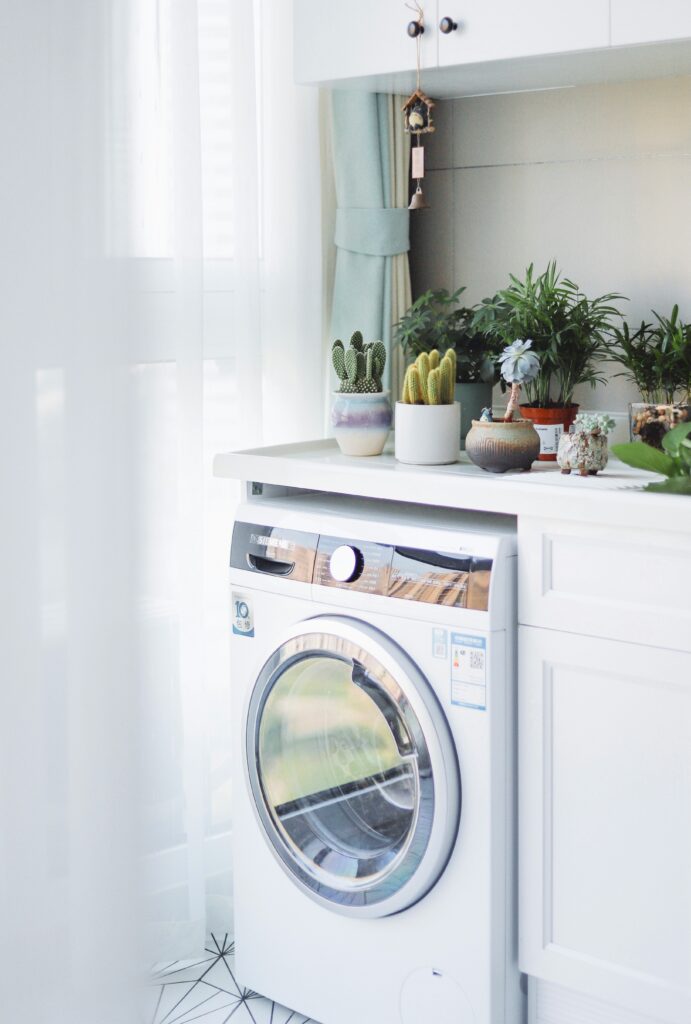 Efficiently designed laundry space with open shelving, countertop workspace, and smart storage solutions for a clean and organized look.